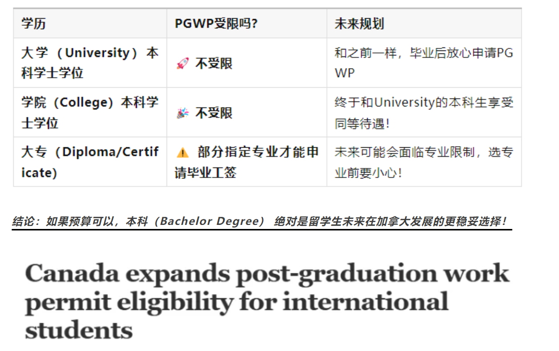 只有University(大学)授予的本科学士学位(Bachelor Degree)的毕业生才能100%稳稳申请PGWP。
