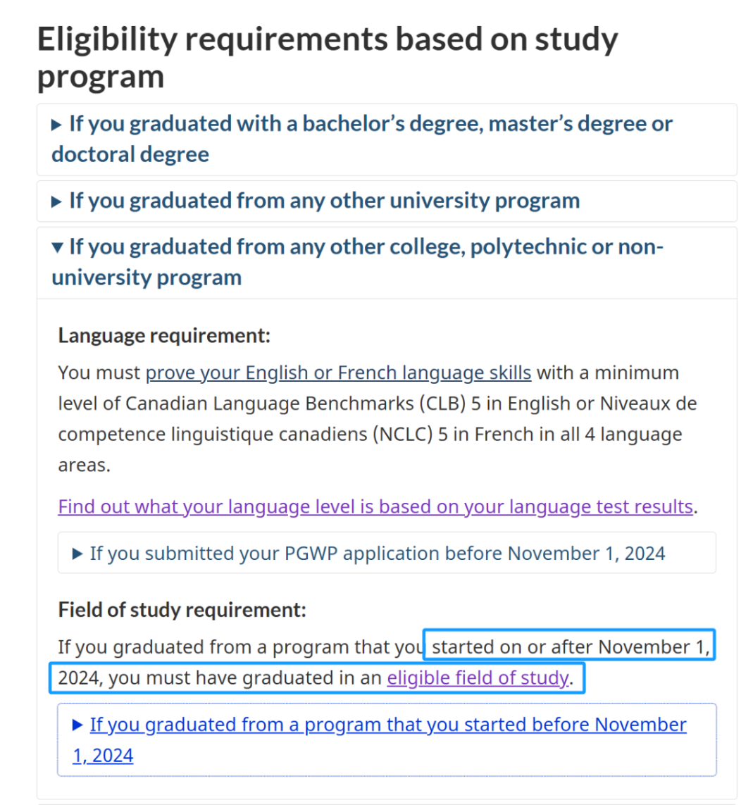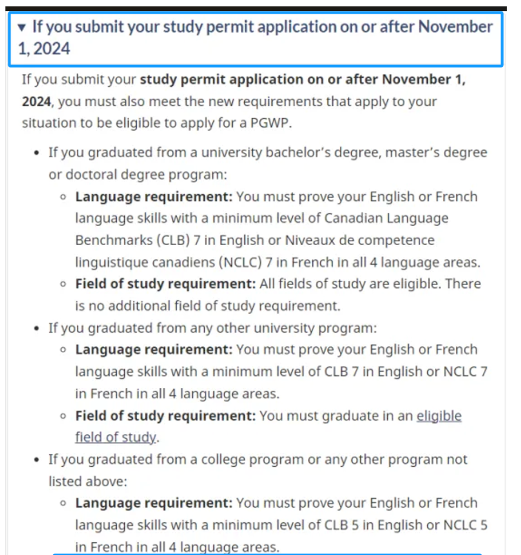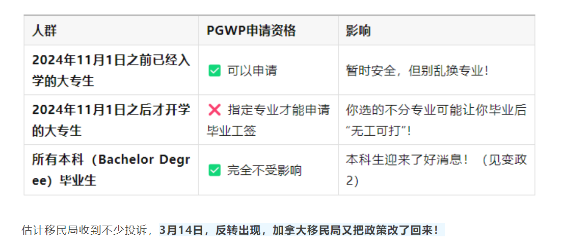 如果你2024年11月1日之前还没正式开学(比如你在等offer或者还没入境),那你未来毕业时,只有在指定专业毕业,才能申请毕业工签PGWP!