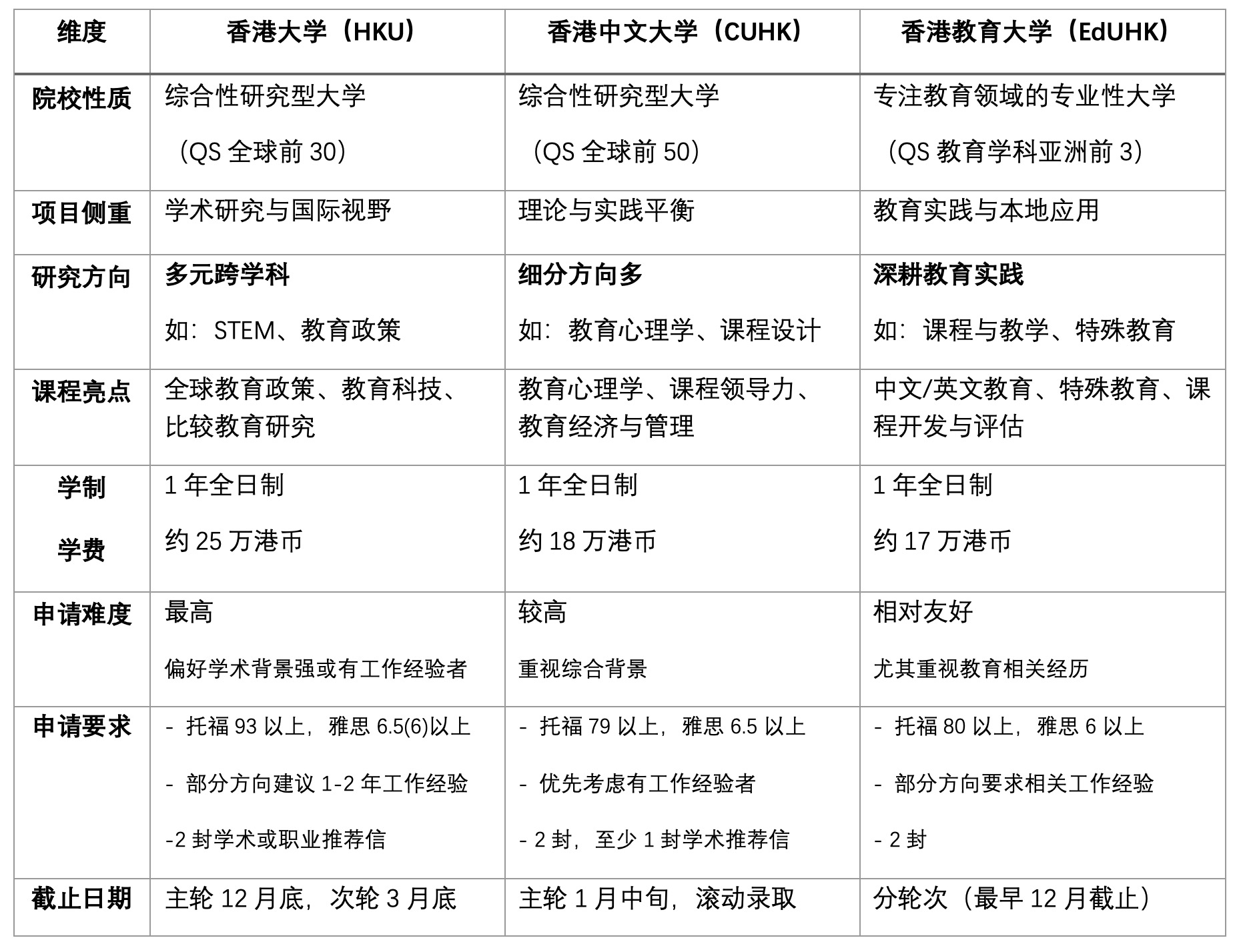 香港大学(HKU)、香港中文大学(CUHK)和香港教育大学(EdUHK)都有教育学硕士(Master of Education,MEd)项目。