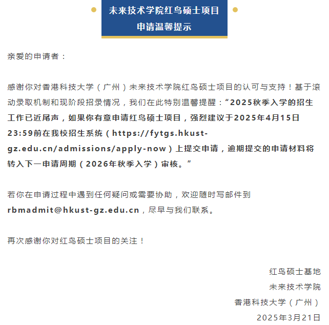 2025.3.21日,香港科技大学(广州)未来技术学院红鸟硕士项目根据录取情况,发布了提前截止的通知,4.15日将是2025季申请的最后日期。请同学们抓紧最后时间,尽快提交申请!