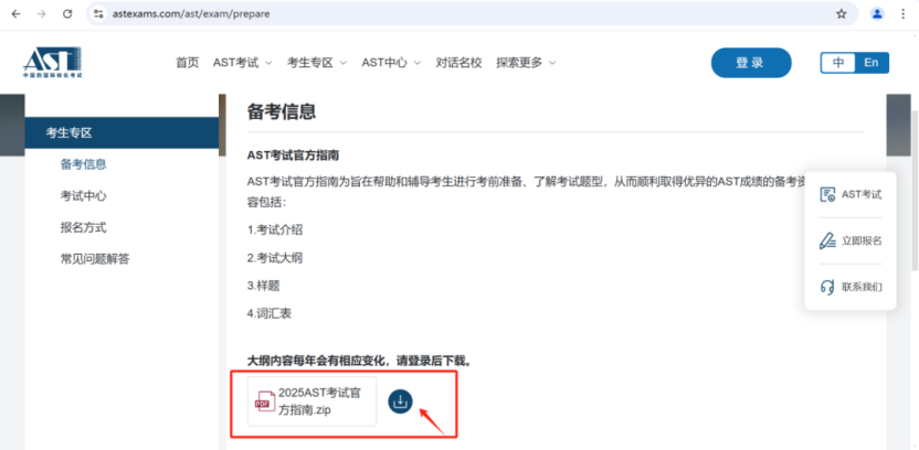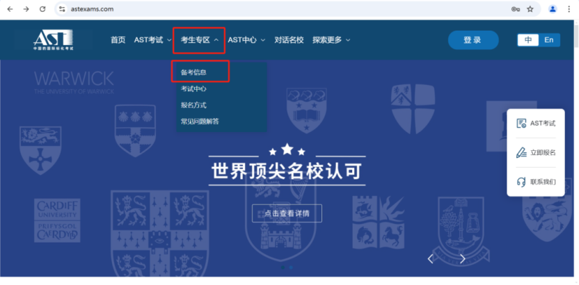 点击导航栏【AST考试】→【考生专区】→【备考信息】