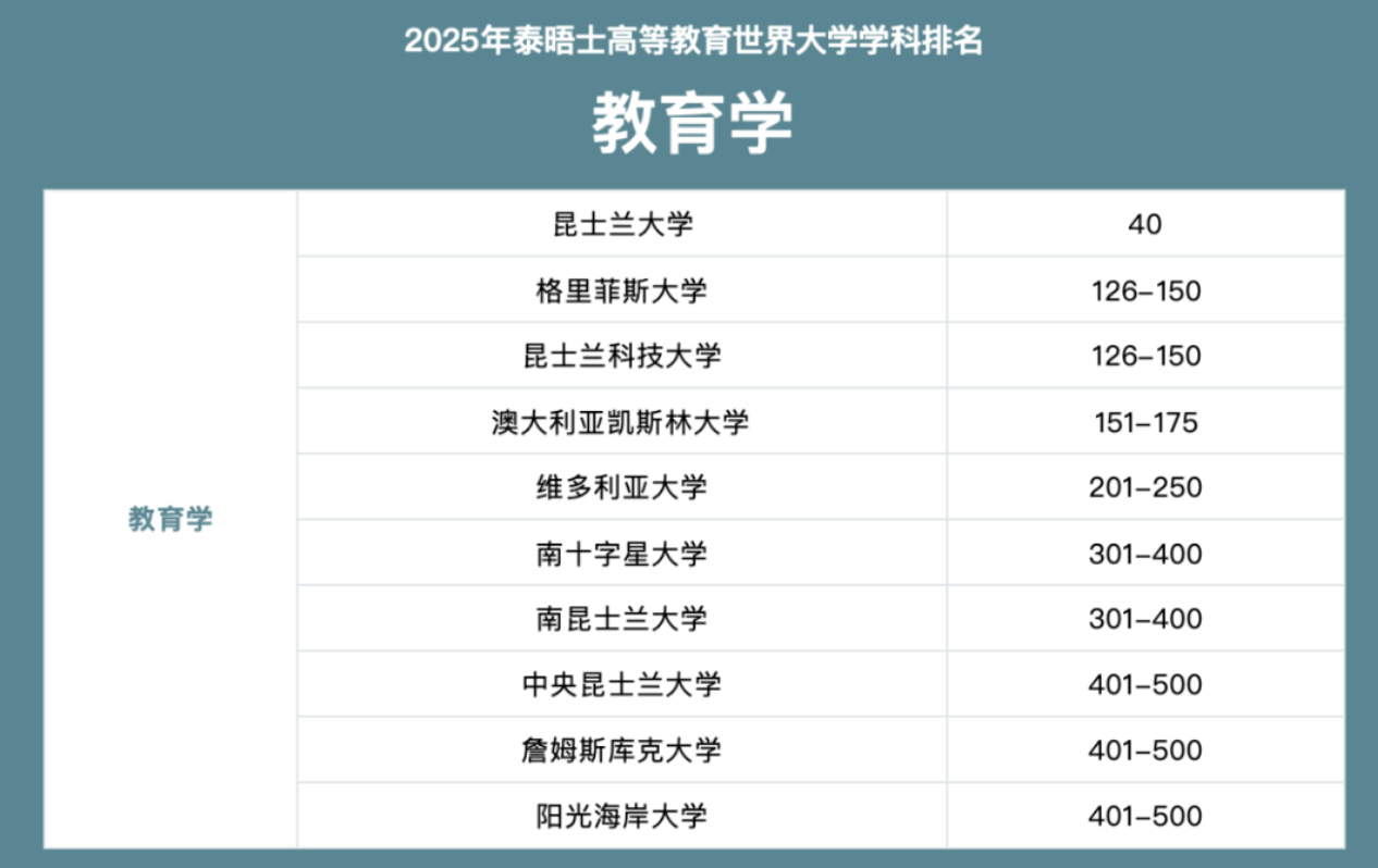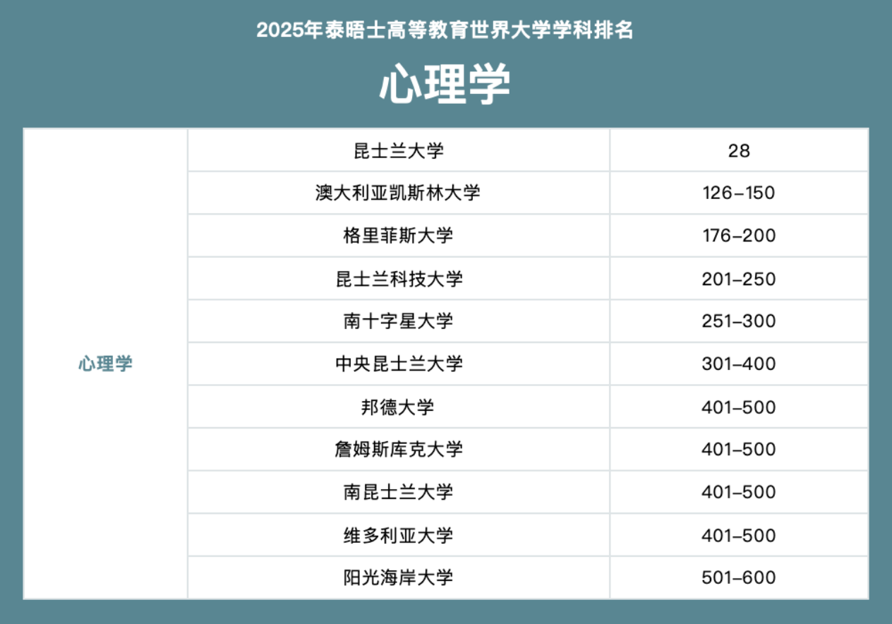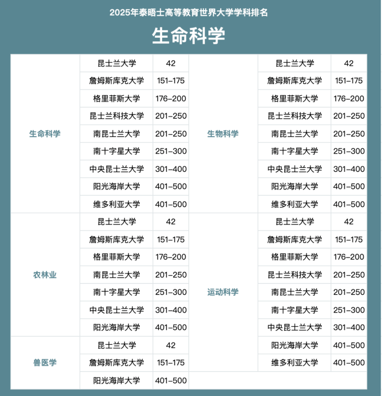 - 昆士兰大学在心理学、教育学和生命科学三项学科中排名世界前50;