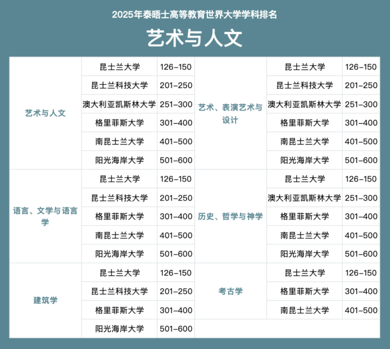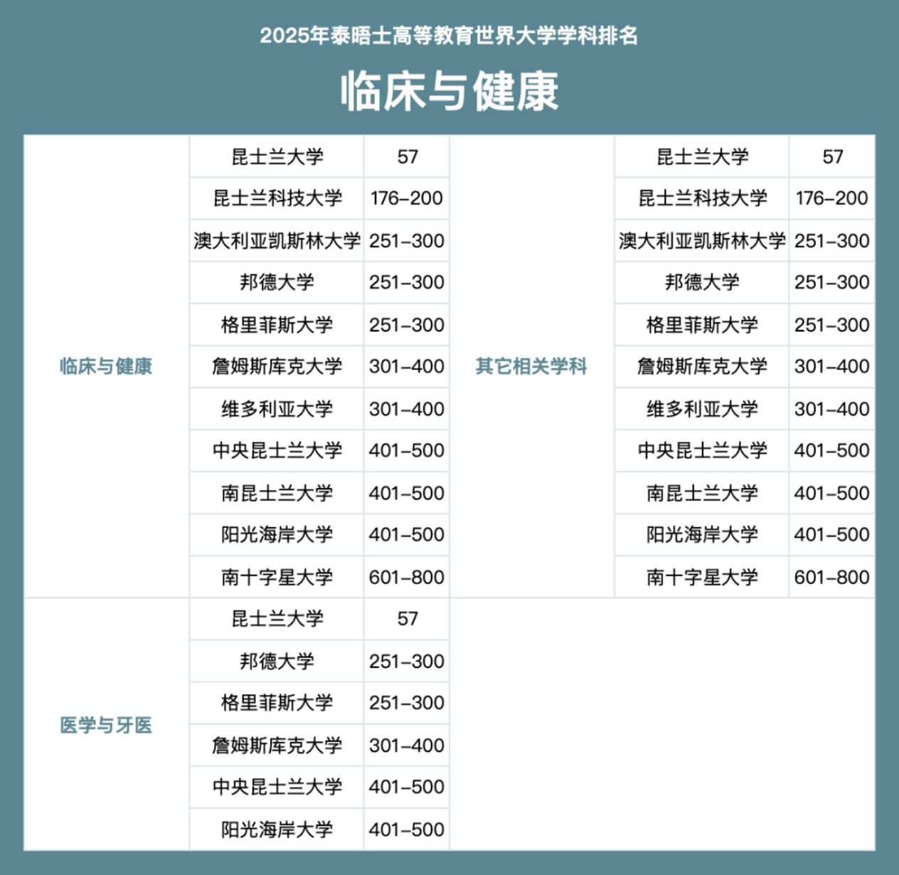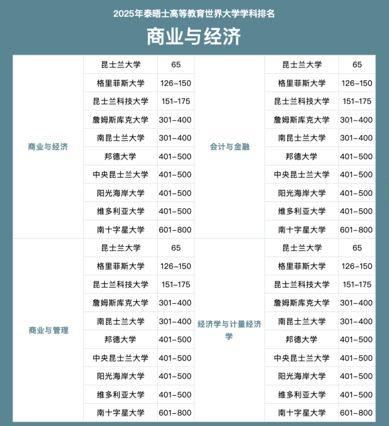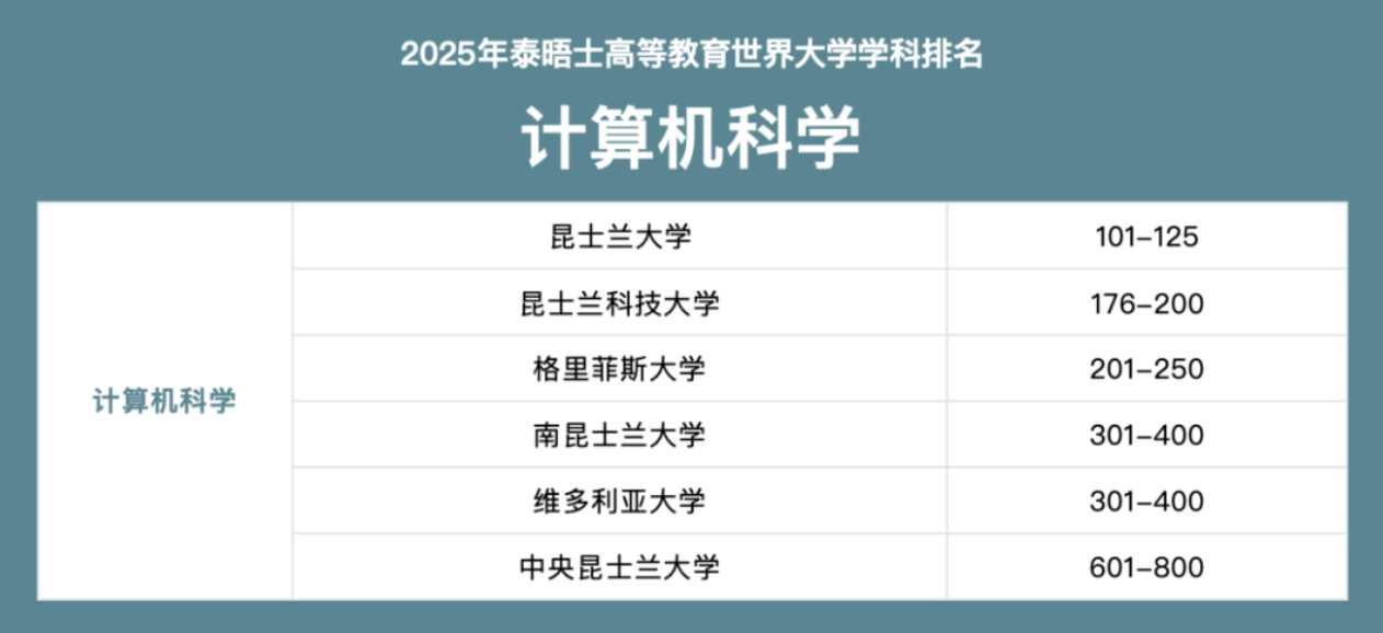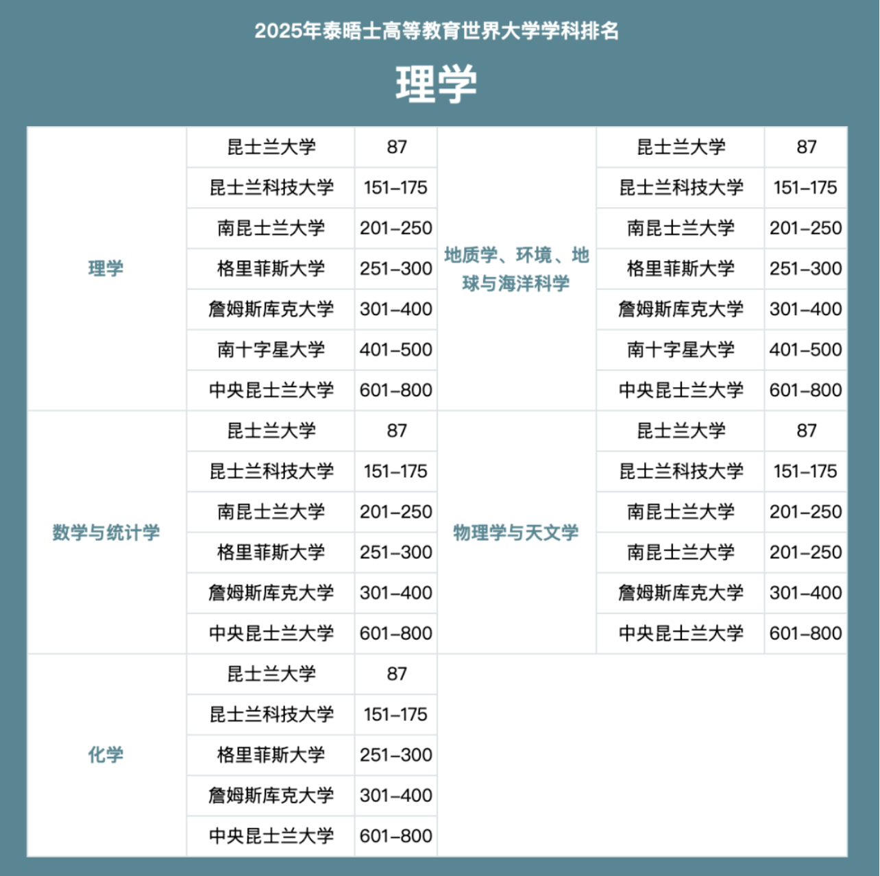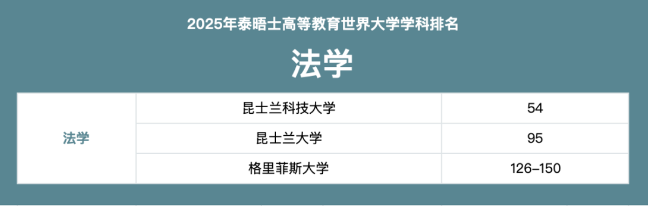 - 昆士兰大学、昆士兰科技大学和格里菲斯进入了所有11个学科排名。
