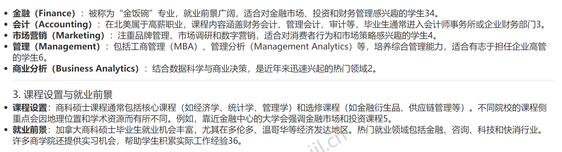 此外,加拿大商科还涉及跨学科项目,例如金融风险管理、管理分析等,为学生提供更专业的细分领域选择24。