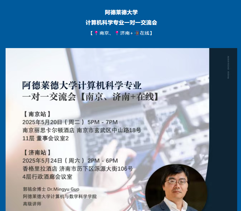 阿德莱德大学将在2025年5月20日(周二)17:00-19:00于南京,5月24日(周六)于济南举办计算机科学专业一对一的沟通交流会,特邀计算机与数学科学学院高级讲师Dr. Mingyu Guo郭铭余博士,为正在申请和计划入读阿德莱德大学相关专业的学生答疑解惑。