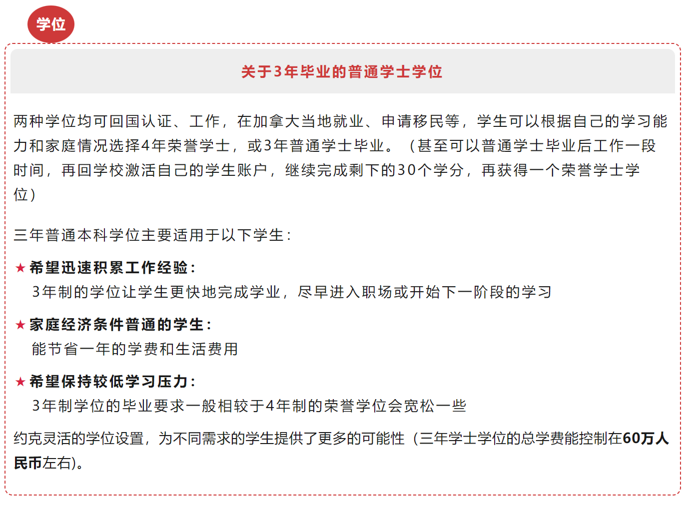 此外,在人性化的约克大学,大部分本科专业除了提供四年(120学分) 毕业的荣誉学士学位 Honourd Bachelor Degree,还同时提供 三年(90学分)毕业的普通学士学位 Ordinary Bachelor Degree 。