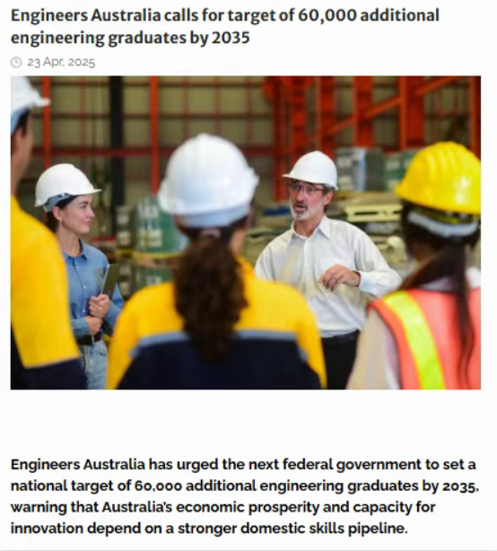 近期,澳大利亚工程师协会(Engineers Australia)发布了最新政策建议文件,呼吁澳大利亚在2035年前培养额外6万名工程专业毕业生,以应对不断扩大的基础设施建设计划、能源系统转型,以及大批工程师即将退休所带来的行业人才缺口。