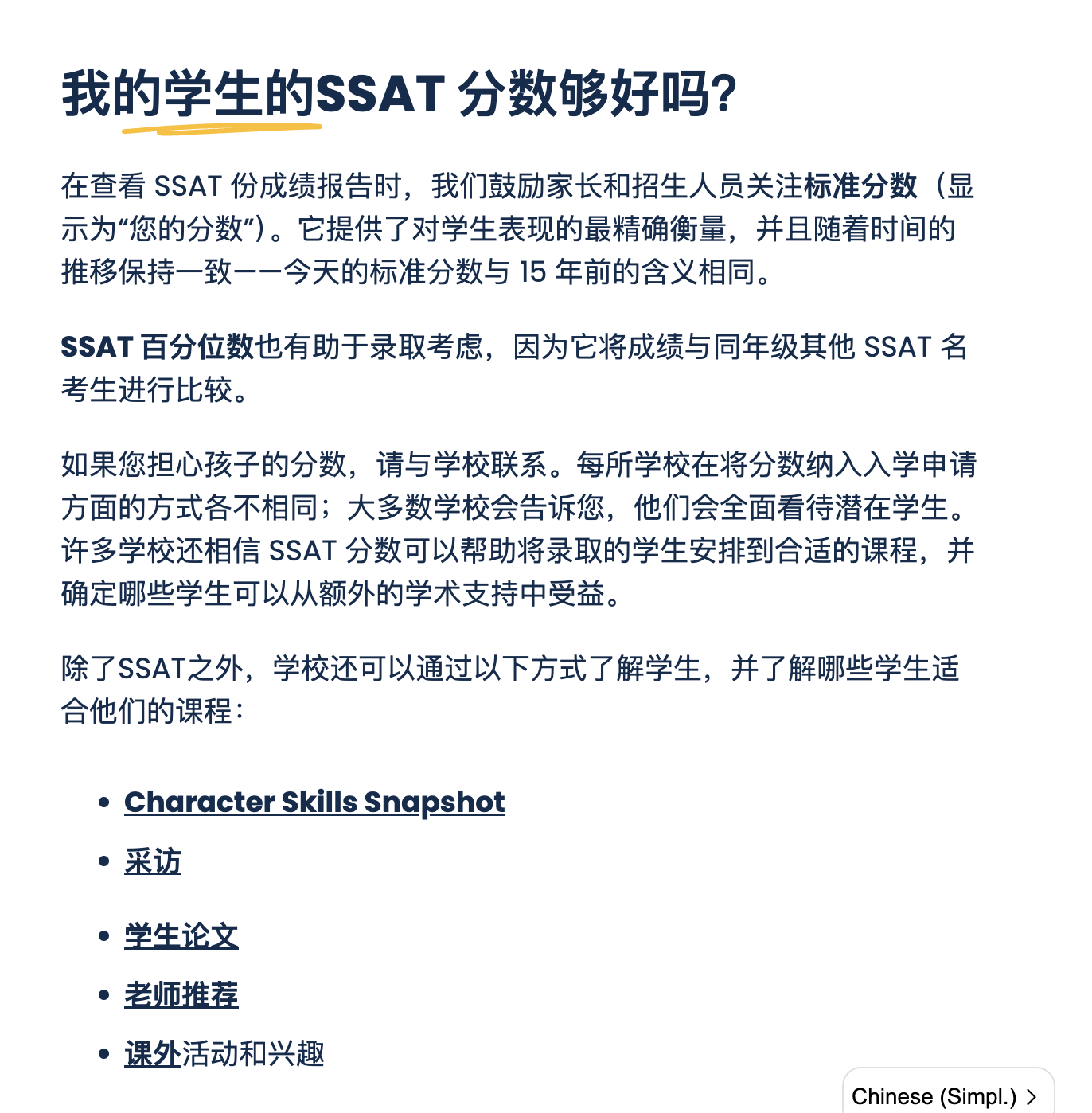 SSAT 百分位数也有助于录取考虑,因为它将成绩与同年级其他 SSAT 名考生进行比较。