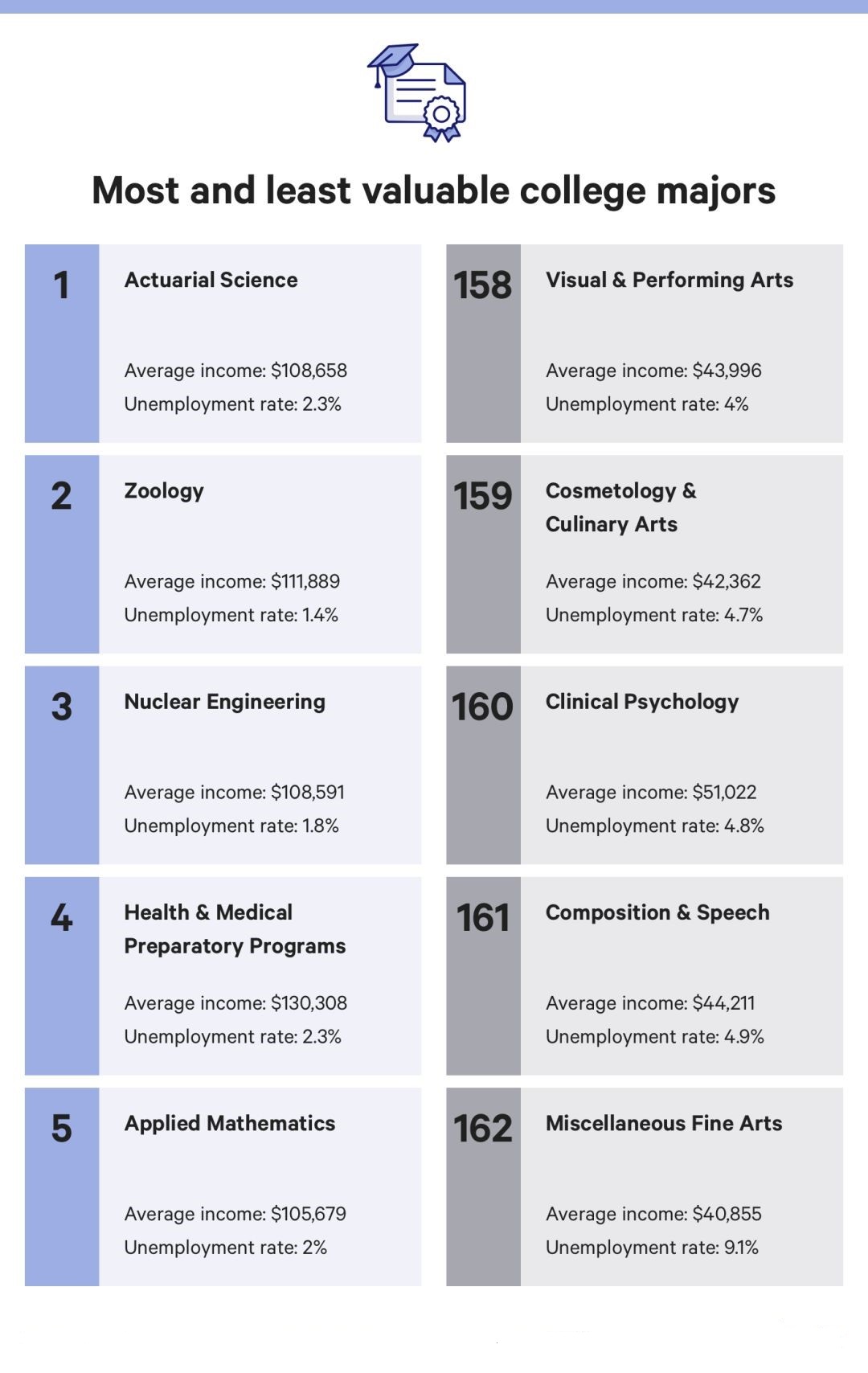 比如,精算之所以成为最具价值的专业,是因为该学位持有者的平均收入( 108,658 美元)高于同龄人,且失业率较低( 2.3 %)。 此外,只有 22 %的精算专业的学生拥有硕士或博士学位,这表明大多数毕业生不需要接受更高的专业教育(这意味着更高的学业负债)就能找到工作。