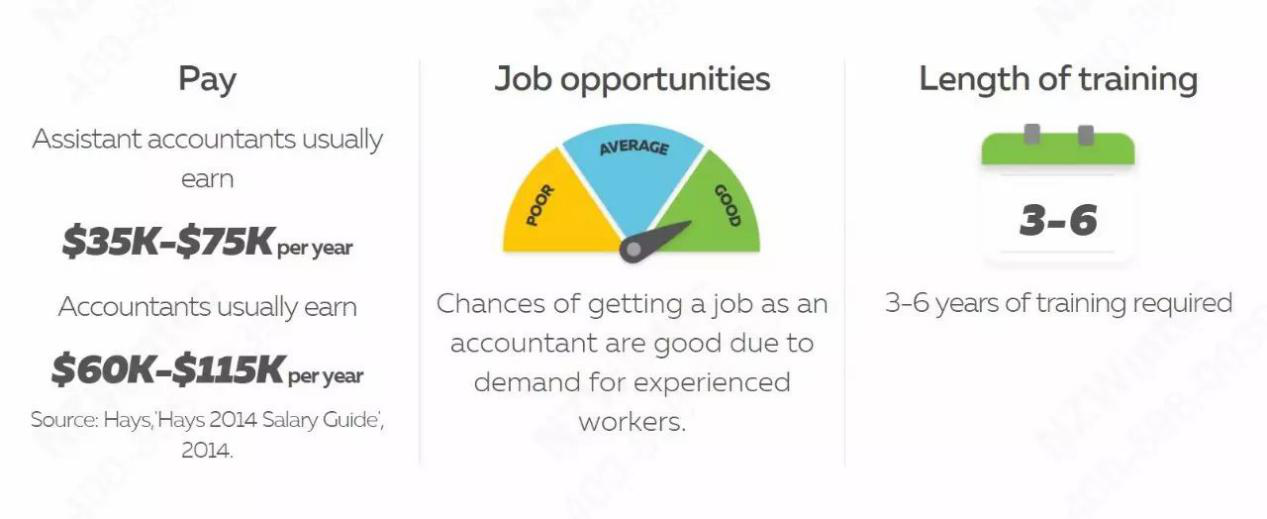 接受会计专业训练的学生并不意味着将来一定要从事直接的会计事务。拥有会计知识的毕业生同样可以从事审计师、财务经理、预算师、精算师等相关工作。在新西兰政府的就业指导网站 CareersNZ 上,对会计相关工作的就业形势指标为“良好”。根据 Hays 今年二月发布的季度招聘市场报告,年薪位于 7 万 5 千至 9 万纽币之间的会计职位在奥克兰地区的需求最为强劲。