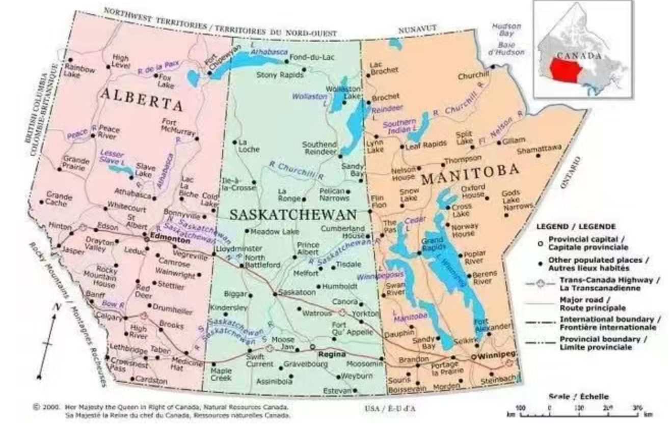 三省合称为 加拿大中部草原三省 ,其中阿尔伯塔省、萨斯喀彻温省是加拿大仅有的两个不靠海的省份,曼尼托巴省西北部濒临大西洋。