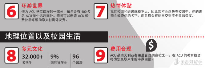 澳大利亚天主教大学为学生提供全澳最佳的学习体验,同时注重培养社会责任感,并将天主教重视知识的传统应用于教学工作之中。学生不仅能够通过在校学习取得非凡的学术成绩,毕业后成为 ACU 70,000 名校友团队中的一员,更能在未来职业道路上成功地扬帆远航!