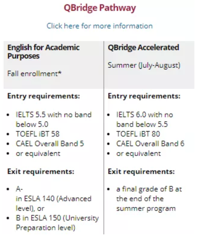 女王大学的双录取项目是通过OUAC进行直接申请语言班的项目,不需要再申请正课。QBrige Accelerate也是要通过Qbrige申请,英语测试成绩较高的学生可以被考虑安排到 QBrige 速学课程里学习。