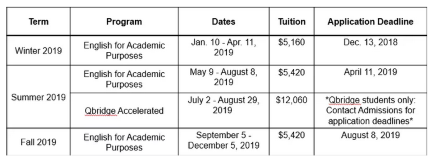 QBrige Accelerate 是针对具有一定最低标准化英语考试成绩的学生而开设的,是一门为期8周的夏季课程,开课日期在7月初-8月末,该项目有助于建立学术成功所需的技能,帮助学生了解女王大学的学习期望。这个以学生为中心的沉浸式课程在学术层面上整合了四种语言阅读、写作、听力和口语的技能,比标准讲座和考试格式课程更具学术上的挑战性和严谨性,更符合交际教室风格。预计学生可以口头沟通他们的想法,分析和批评他人的想法,在基于项目的任务上进行团队合作,因为他们能够调整自己的学术英语水平。学习成功的学生在从事英语学习,撰写论文,参与演讲,研讨会和辩论等方面将表现出较高的学术水平。