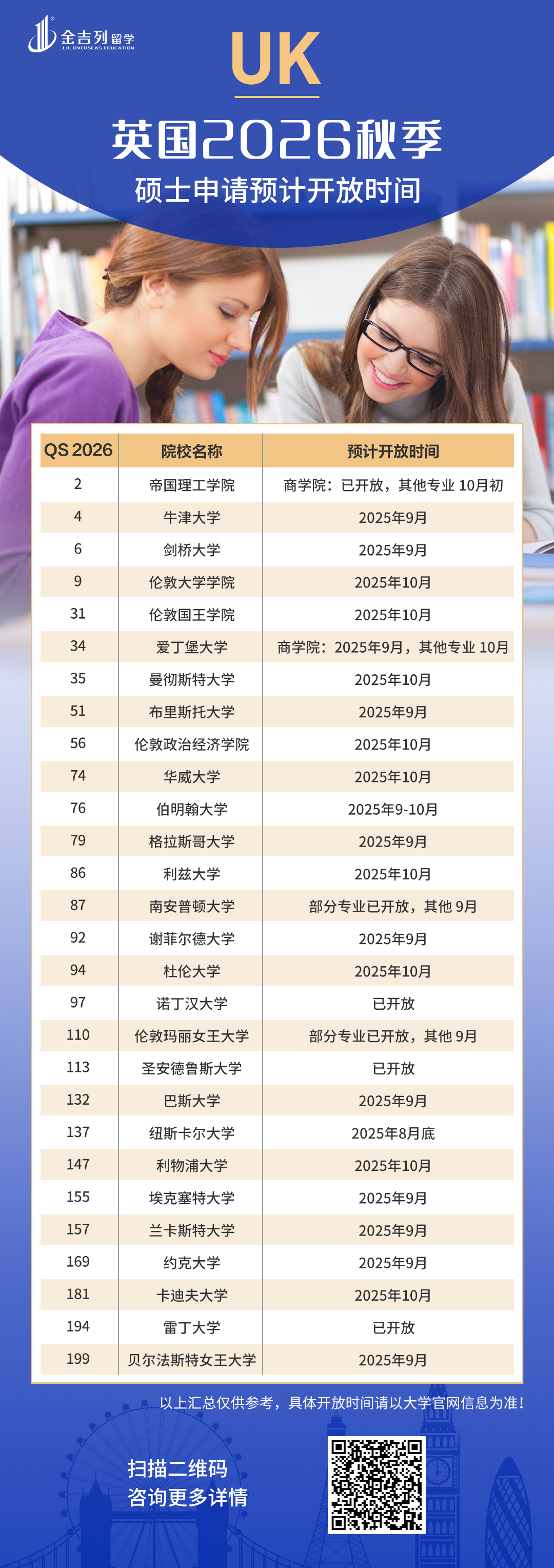 随着时间临近,英国2026年秋季硕士即将拉开大帷幕,QS前百的学校将集中在9-10月开放,想要首批递交申请的学子们,现在就可以准备制作材料,提前安排啦~
