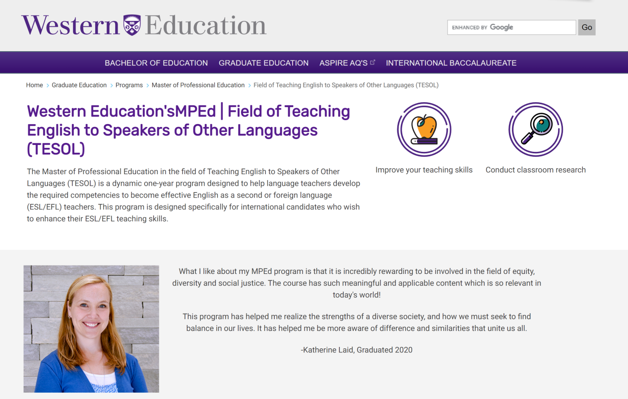韦士敦大学(原西安大略大学)教育硕士 – TESOL MPED in Teaching English to Speakers of Other Languages 曾一度停止招生,该项目在2023年秋季重新恢复招生。