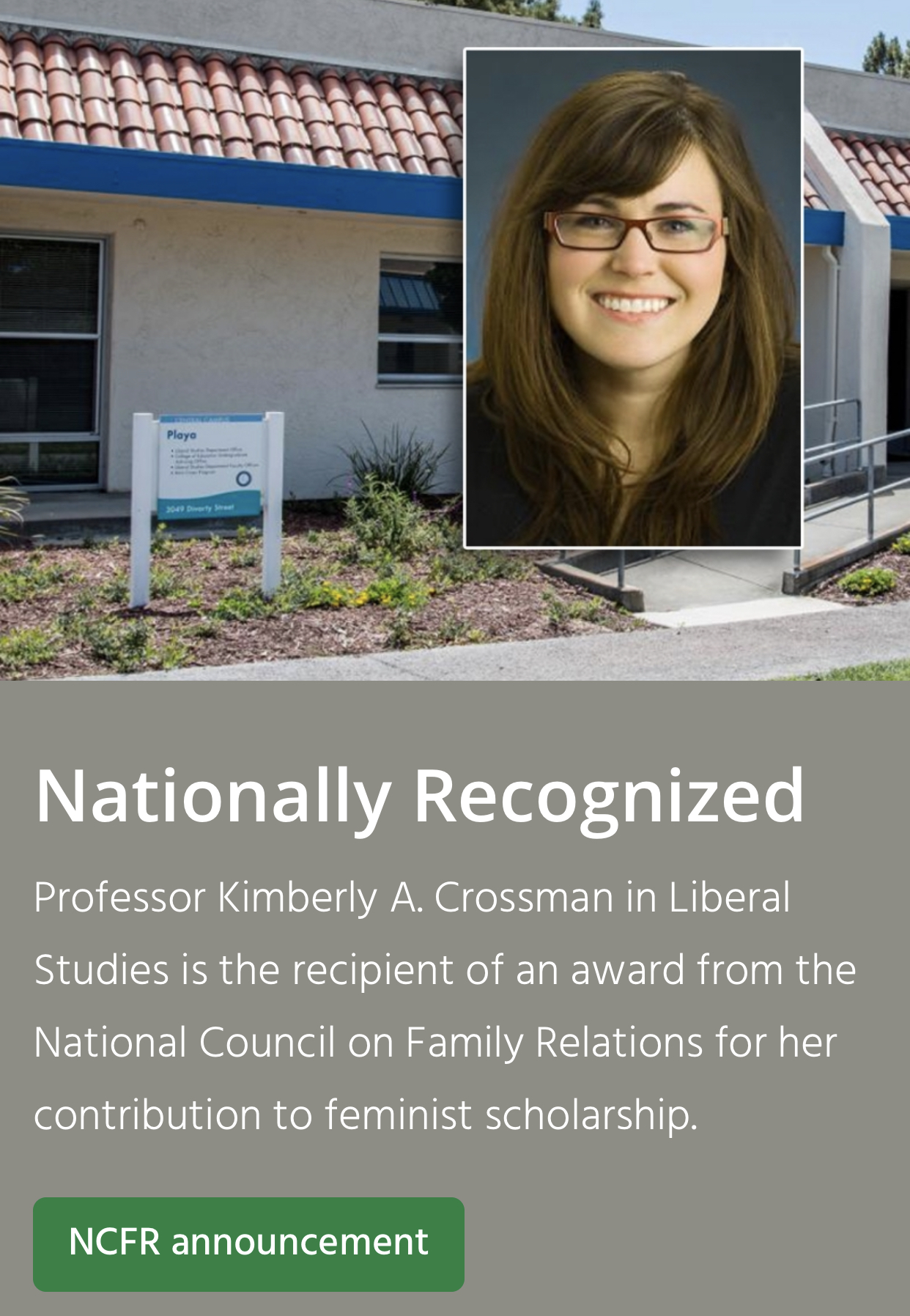 文学研究的教授Kimberly A. Crossman教授获国家家庭关系委员会奖,表彰她对女权主义奖学金的贡献.