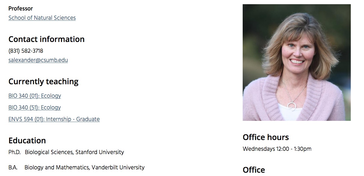 毕业于斯坦福大学 生物科学博士 Susan Alexaner 不仅教授本科的基础课程,还负责一节研究生的实习课程,专门为学生工作实习提供指导。