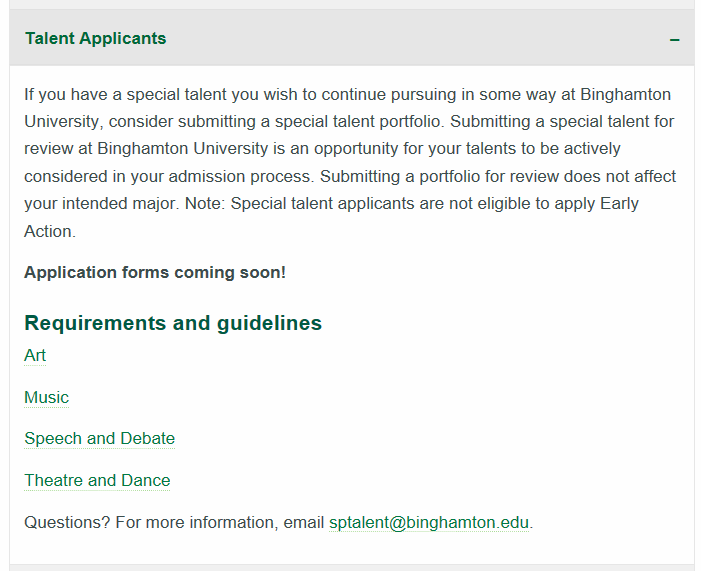 对于一些有特殊才华的申请者来说,可以递交额外的作品集,从而增加自己的申请成功率,且即使作品集并不优异,也不会影响原本的审核。特殊才华及才能包括在以下领域:艺术,音乐,演讲与辩论,戏剧与舞蹈。