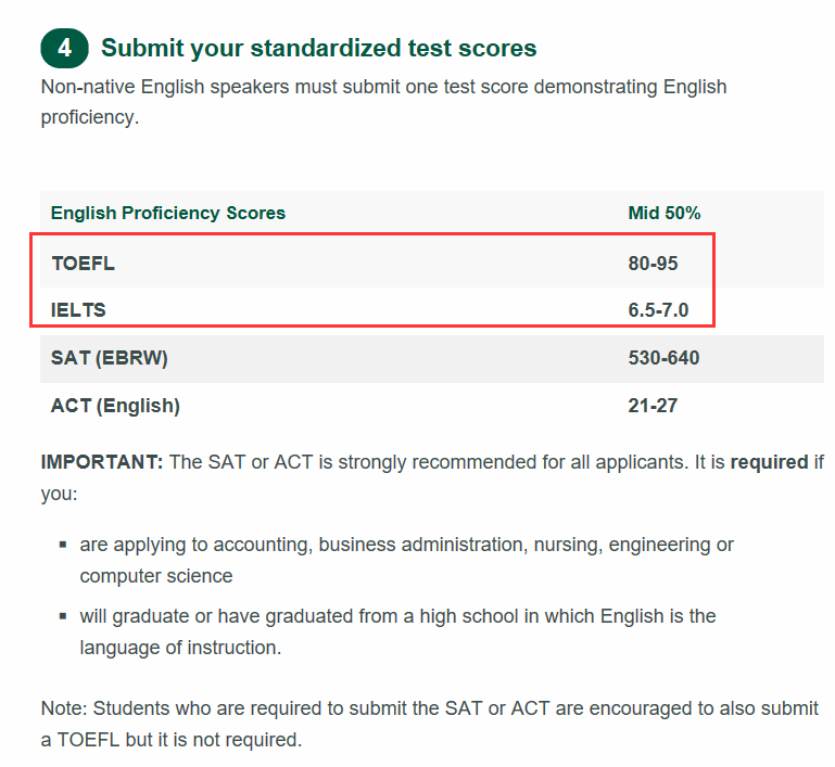 对于国际学生的语言成绩要求为:雅思:6.5-7.0,托福:80-95之间。如东娜老师之前所说,国际学生可以不提供SAT或ACT成绩,但是强烈建议。一般情况下,虽然学校并不强制SAT分数,但提供一个1250+的SAT分数,不止可以增加申请成功率,更可以被优先考虑发放奖学金。