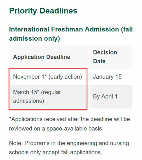 申请的截止时间如上,早申请的截止时间与大多数美国院校一样,为11月1日。常规申请的截至时间为3月15日。申请者在过了截至日期之后还有机会申请,但却取决于学校是否还有名额。