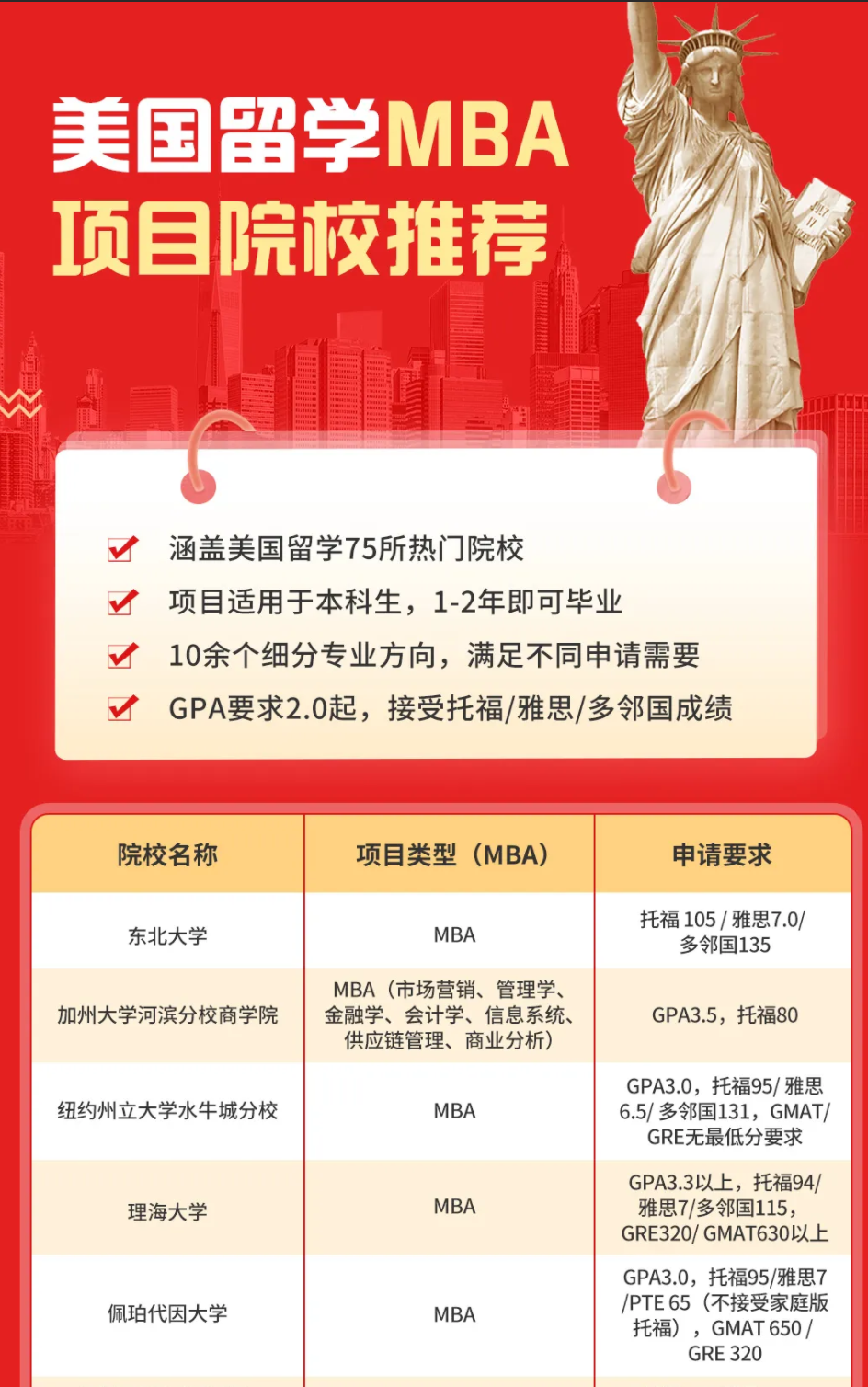 - 长岛大学 MBA: GPA2.5 即可,托福 65 / 雅思 6.0,适合想快速拿学位、提升学历的同学;