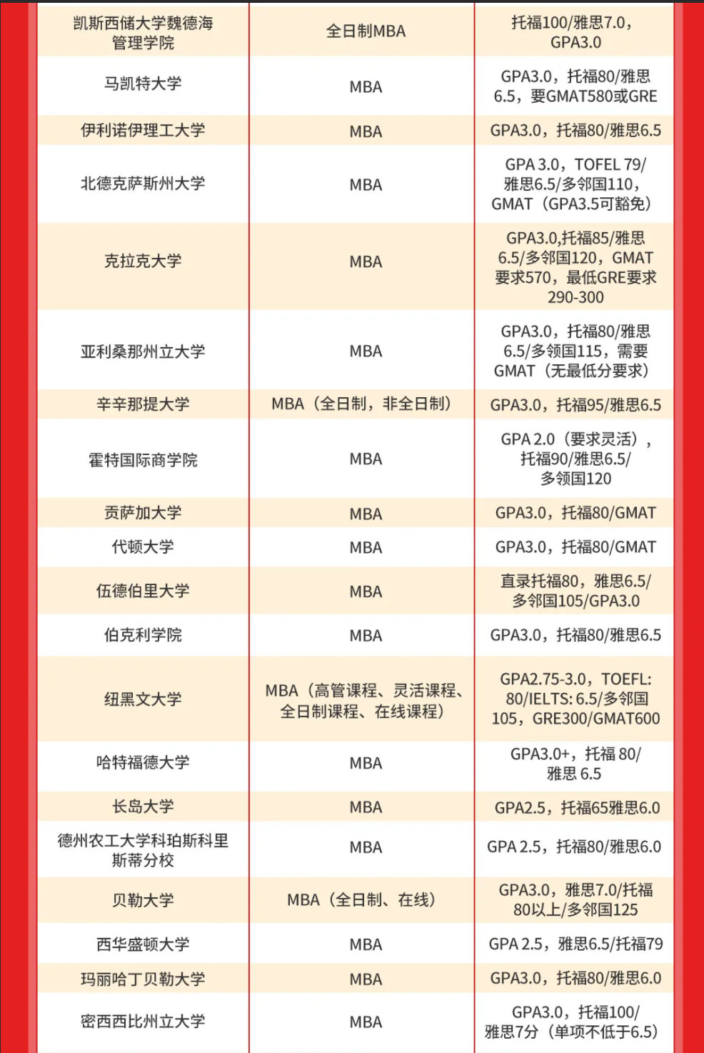 - 纽约州立大学水牛城分校 MBA: GPA3.0 即可,托福 95/ 雅思 6.5/,GMAT/GRE 无最低要求,性价比高,适合想读名校但成绩中等的同学;