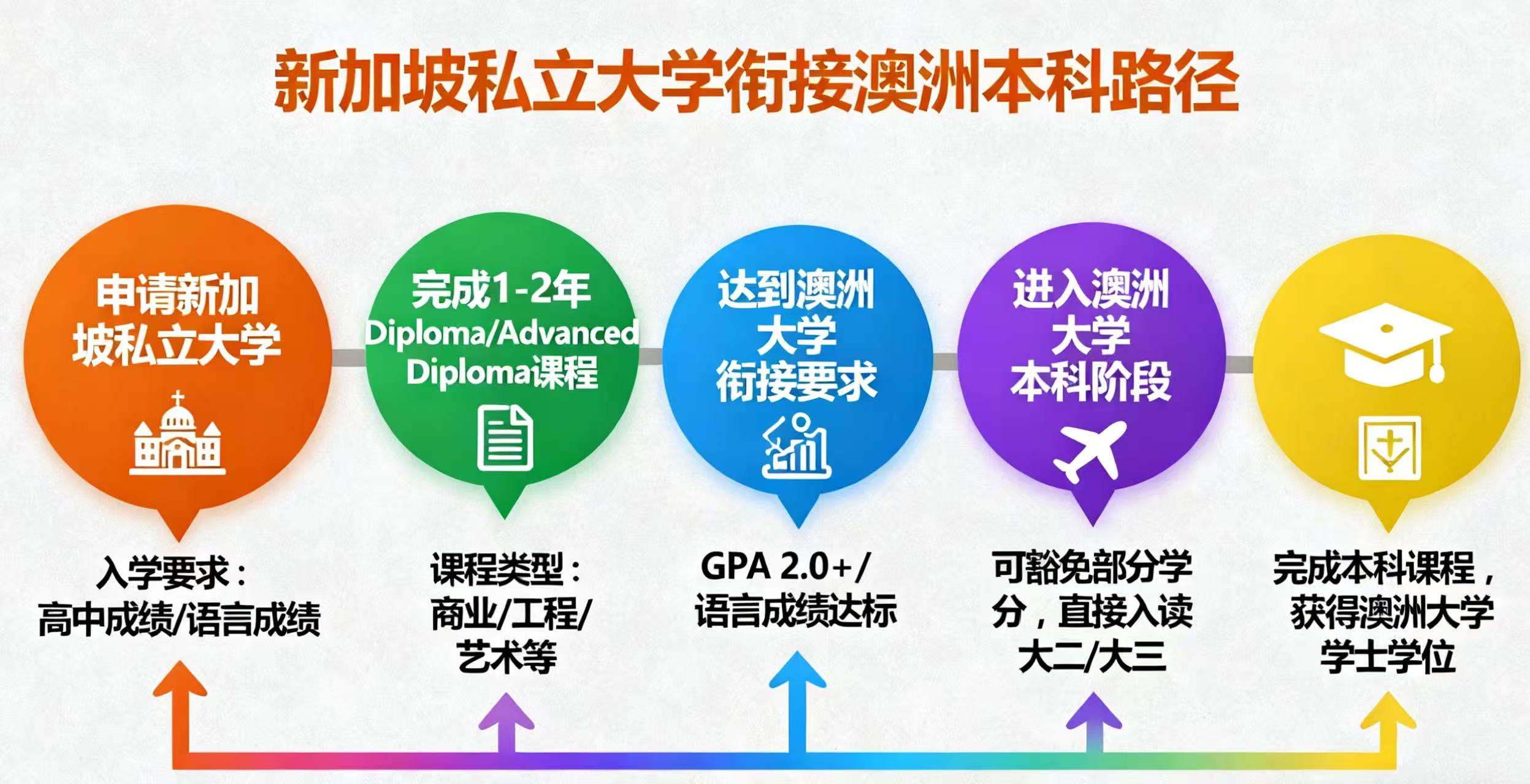 - 学生通过新加坡院校完成申请材料,学校协助衔接目标澳洲大学