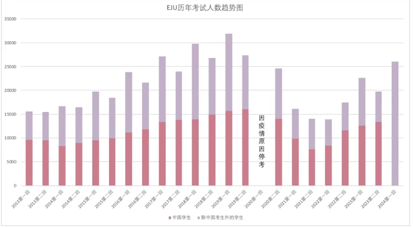 随着国内高考竞争的白热化,邻国日本的大学入学考试正受到更多的青睐。 根据日本学生支援机构(JASSO)的数据显示,近十年,EJU报考人数从2013年的15,613人增长到2024年的27,248人,增长率达到了75%,其中,大陆考生数量由9,575人增长了35%,到达了2024年的12,938人。