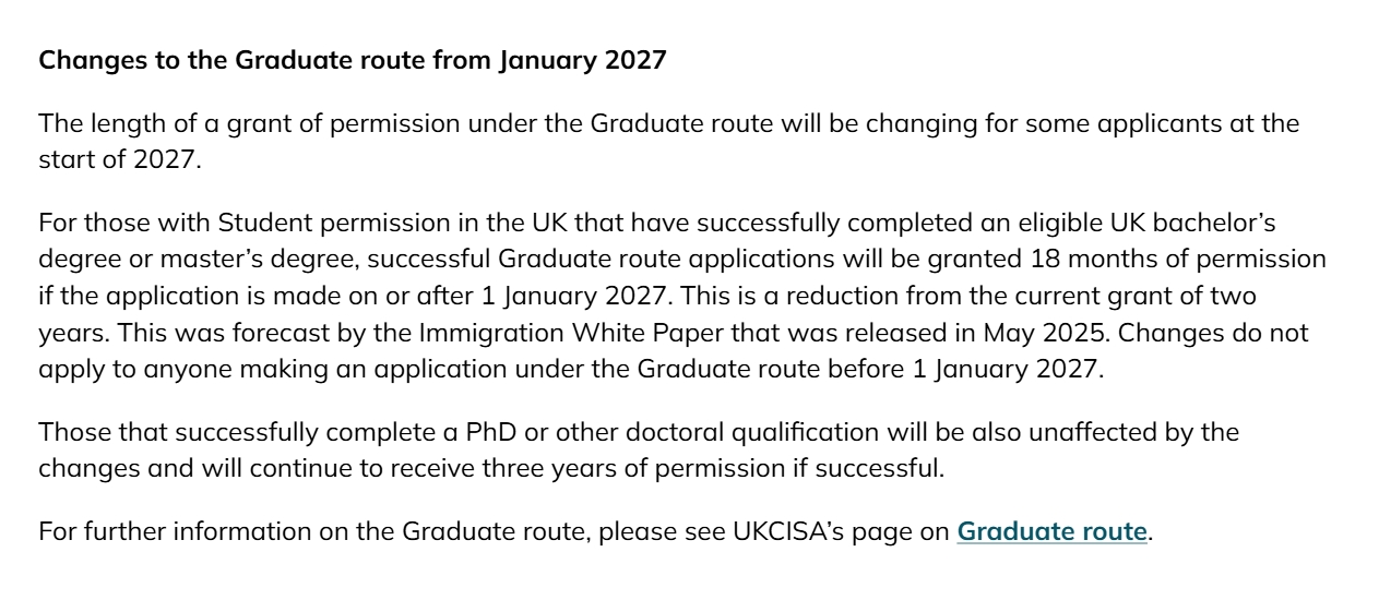 (1)对于在英国持有学生签证且已成功完成符合条件的英国学士学位或硕士学位的人来说,若在2027年1月1日或之后提交毕业生签证申请并获得批准,将获得18个月的签证时长。这较目前的两年有所缩短。