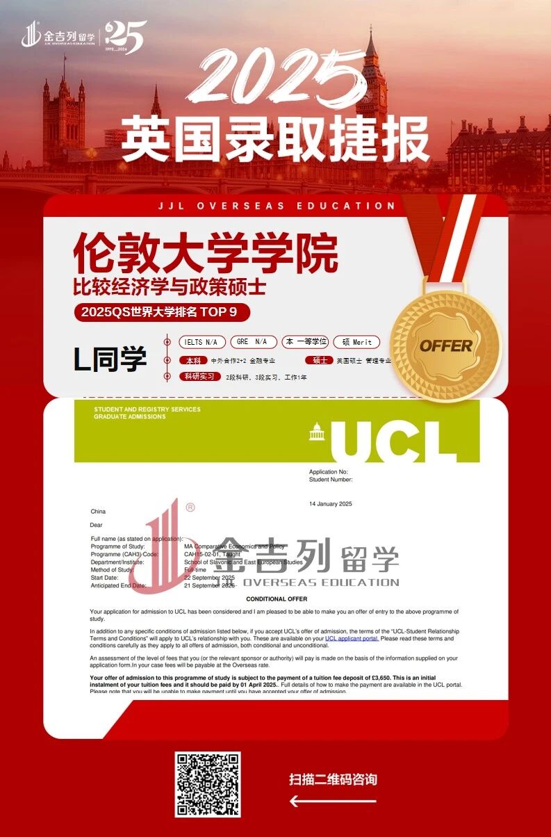 热烈祝贺 L 同学凭借清晰的规划与精准的申请策略,成功斩获 伦敦大学学院(UCL)比较经济学与政策硕士 录取!