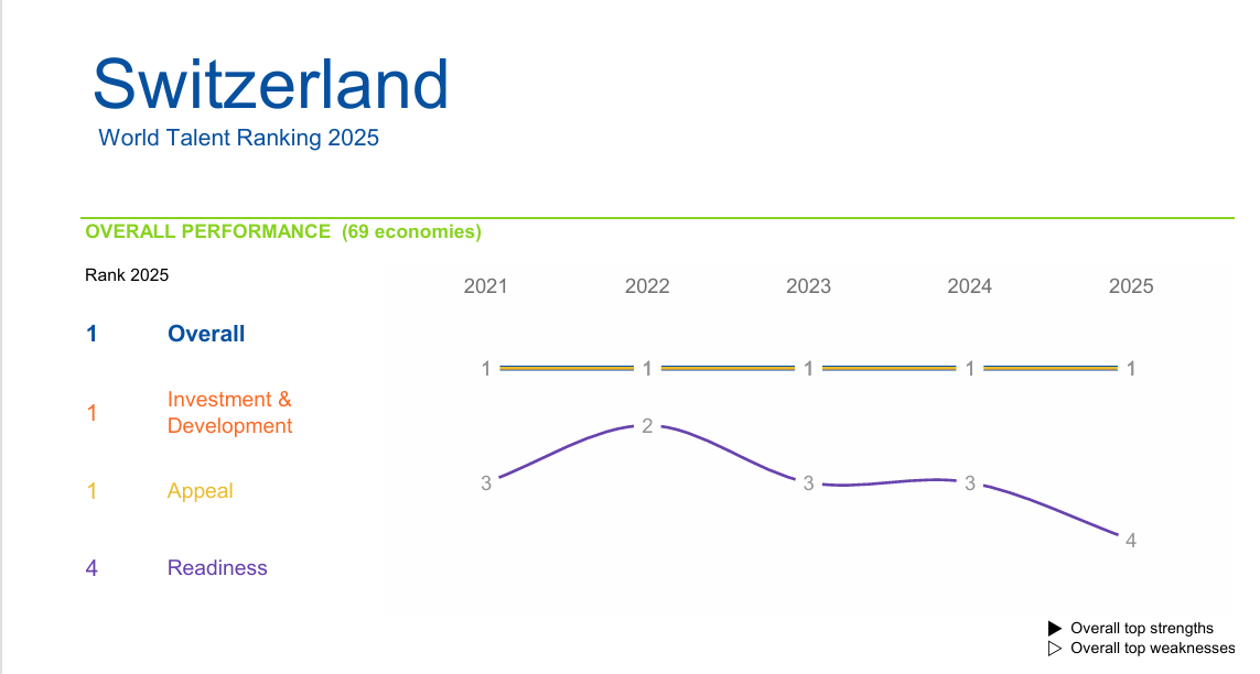 整体而言,欧洲在人才领域的传统优势依旧稳固,尤其瑞士,凭借成熟强大的人才生态体系,已实现连续五年全球第一,充分彰显了其在该领域的绝对竞争力。