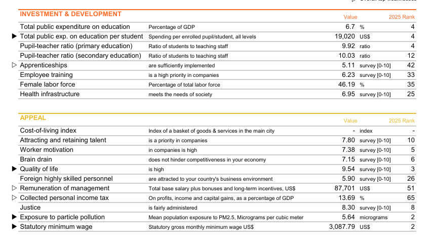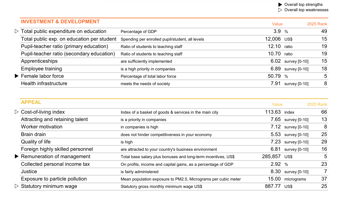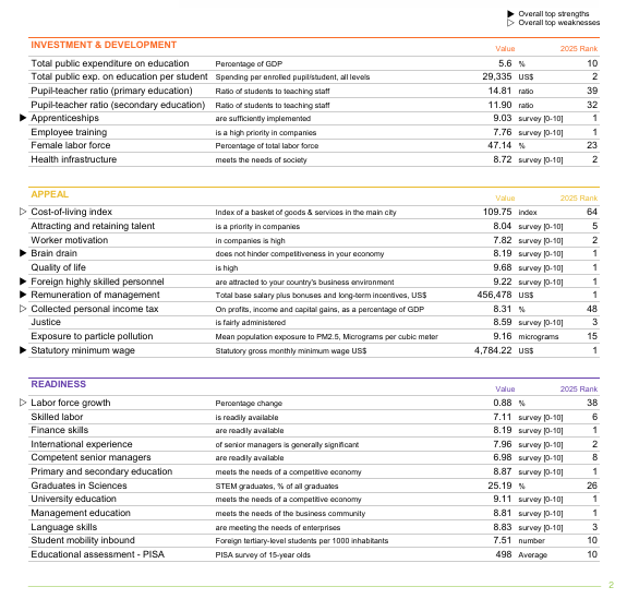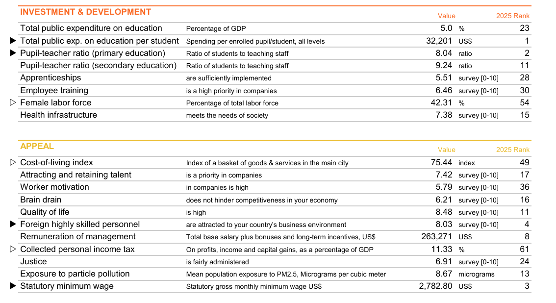 瑞士的学徒制(9.03分)、吸引外国高技能人才(9.22分)、法定最低工资(4.784.22 US$)等多个方面表现出色,在全球排名中位于第一,成为其主要优势。