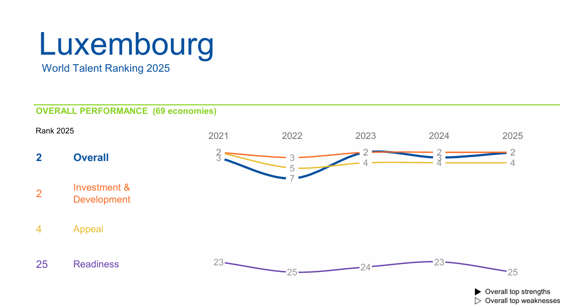 卢森堡较去年,排名上升一位,在每位学生的公共教育总支出(32,201 US$)、师生比例(8.04)、语言技能(8.48分)位于全球前排。但在女性劳动力占比(42.31%)、生活成本指数(75.44)表现稍显逊色。