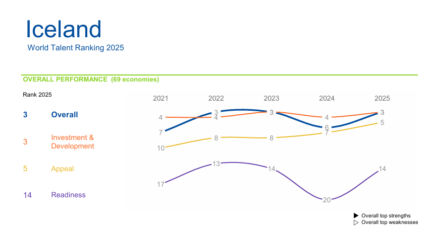 冰岛较去年总排名上升3位,在生活质量(9.54分)、语言技能(8.95分)、法定最低工资(3,087.79 US$)表现强劲。