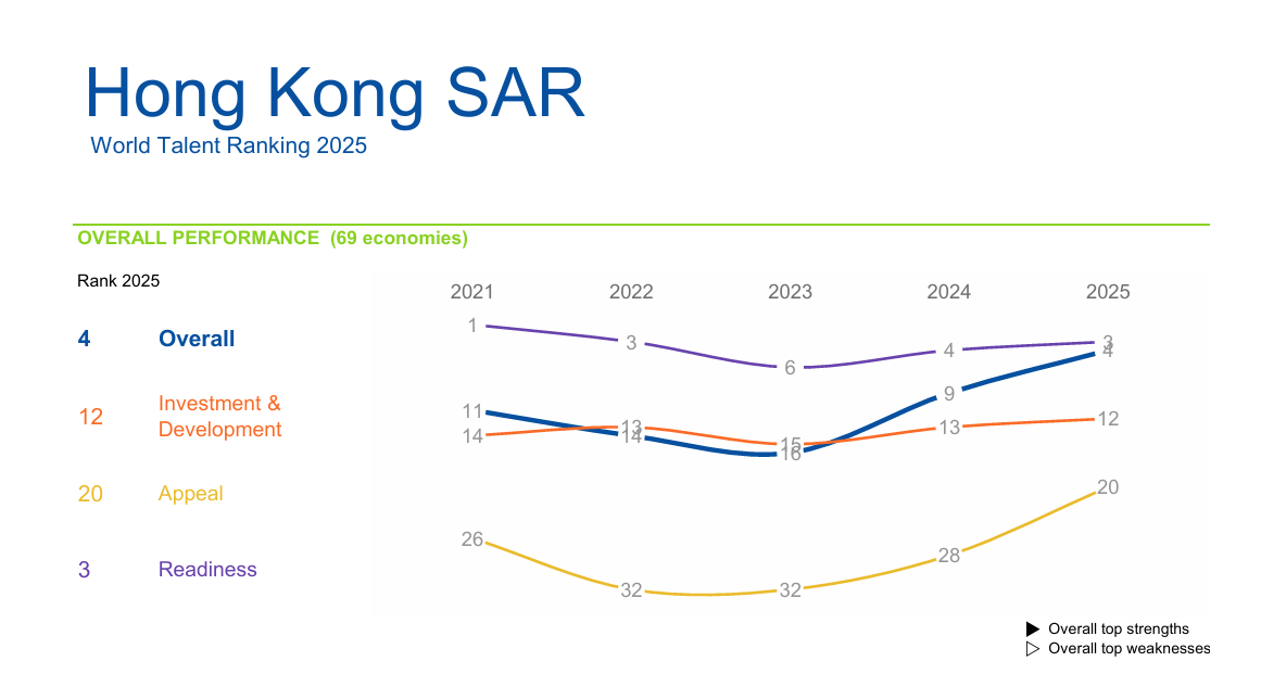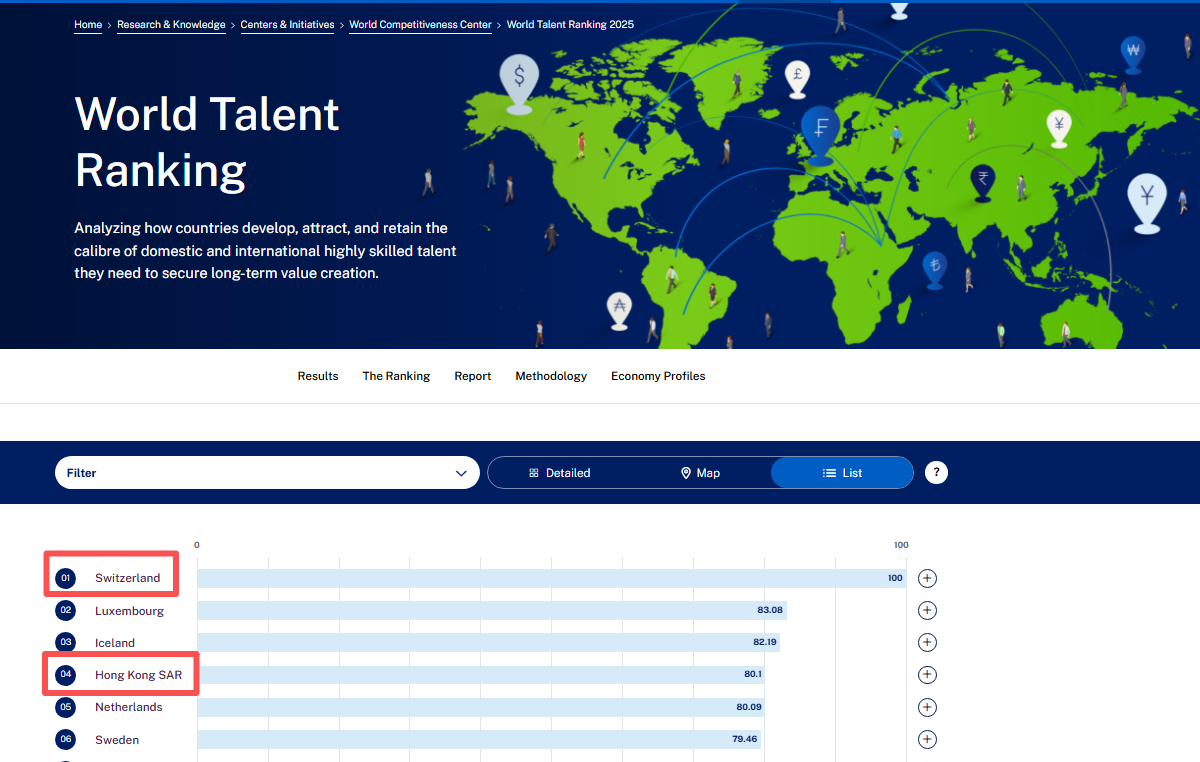 亚洲地区的中国香港、新加坡、阿联酋进入此榜单前十,其中,中国香港位列第4,较去年提升 5 位,港府此前大力推行的人才引进政策持续释放效益,推动其排名稳步攀升;新加坡排名第 7 ,较去年下降 5 位;而阿联酋则迎来重大突破,在较去年上升 8 位的同时,首次跻身前十,成功占据第 9 位。