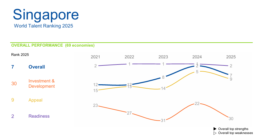 新加坡此次排名下降明显,由去年的总排名第2下降到今年总排名第7。其中投资与发展指标下降8名,对本地或海外人才的吸引力指标下降4名,就绪度下降1名。