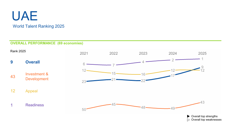 阿联酋首次进入榜单前十!主要通过政策红利吸引国际人才,在人才投资与发展方面表现突出,师生比例(8.6分)和健康基础设施建设(8.36分)方面,位居全球前三。