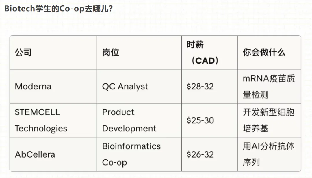 生物科技学生通常能获得每小时28加元的Co-op职位。一个学期(4个月)税后收入约15,000加元,足以支付下学期的学费和生活费。
