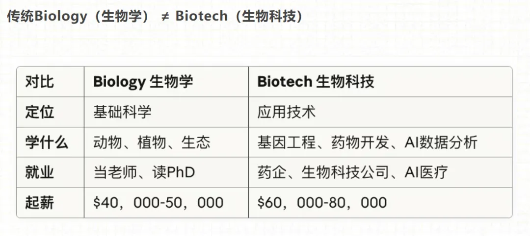 传统生物学 ≠ 生物科技。前者侧重于理论研究,而后者是将生物学原理应用于实际问题的交叉学科,融合了生物化学、分子生物学、数据科学和工程学等多个领域。