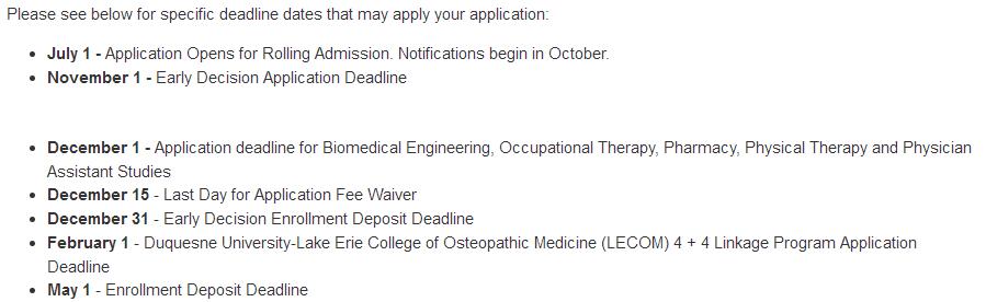 杜肯大学提供本科、硕士、博士三种学位类型。1878年10月份首次开课,那时学校名为匹兹堡天主教学院,招生人数共40名学生和6名教师。到1911年,该校成为宾夕法尼亚州第一所天主教大学。杜肯大学校园占地约49英亩,现有学生总人数10000名。除匹兹堡外,学校在罗马也建有分校区并拥有10多个教学点。目前杜肯大学在匹兹堡市翻天覆地的变化过程中,一直追随着匹兹堡市建设的脚步,为匹兹堡市的建设提供大量的商业管理、生物科技、医疗卫生人才也吸引着越来越多的学生申请,每年杜肯大学的开学时间基本都在8月—9月,而这个时间也是学校比较繁忙的时间。