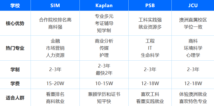 其实新加坡私校没有“好坏”,只有“适合与否”。比如你想冲名校就选SIM;想快速拿证+考证就选Kaplan;想读工科搞技术就选PSB;想体验澳洲直属校区就选JCU。但很多同学不知道的是,每个学校的不同专业还有“隐性门槛”——比如SIM的金融专业其实更偏爱有数学背景的学生,Kaplan的传媒专业需要提交作品集