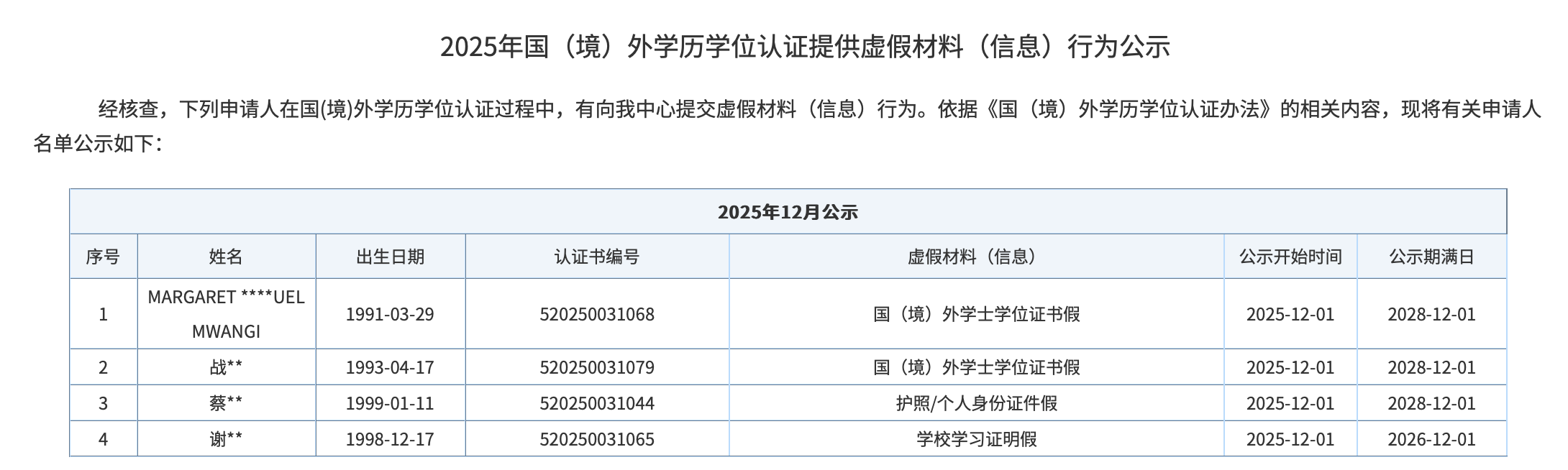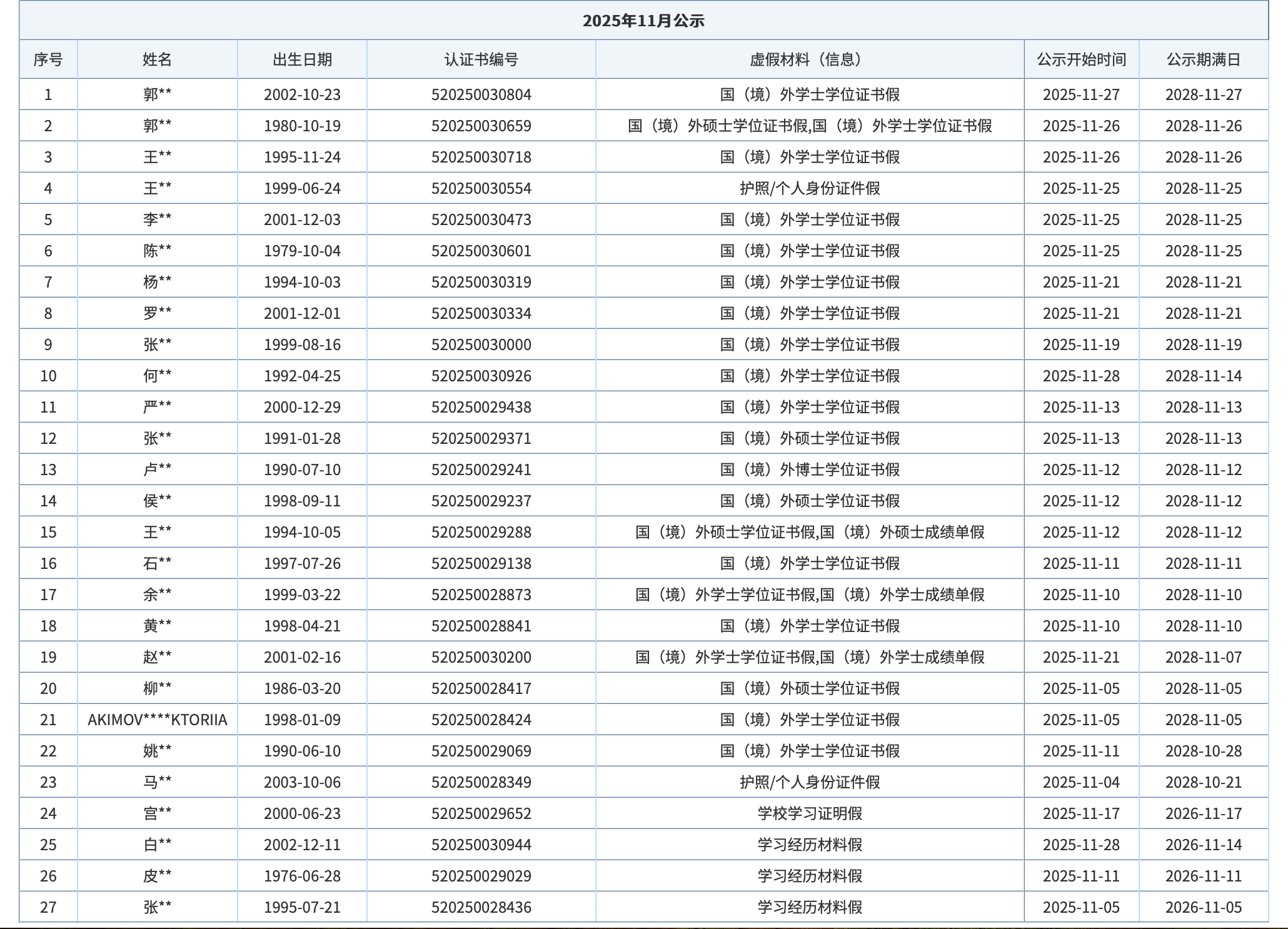 截至12月1日,12月已有3名申请人因提供虚假信息被公示;11月期间,共有26名申请人因同类违规情况被官方公示。