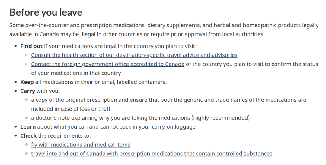 我们理解每位出行或者准备前往加拿大留学的学子行李中,药品的准备一定是重要的一环。在准备您的药品清单之前,请先了解加拿大对于药品的管制规定。根据加拿大出入境相关规定,旅客仅允许携带一个疗程或90天用量的药品。无论是处方药还是非处方药,都必须为医院或药房包装,并带有使用说明的原始标签或零售包装。为了确保您的旅行顺利,请务必遵守这些规定。如果有任何疑问,可以访问官方页面查询更多信息(点击文末“阅读原文可以直达链接”):https://travel.gc.ca/travelling/health-safety/medication