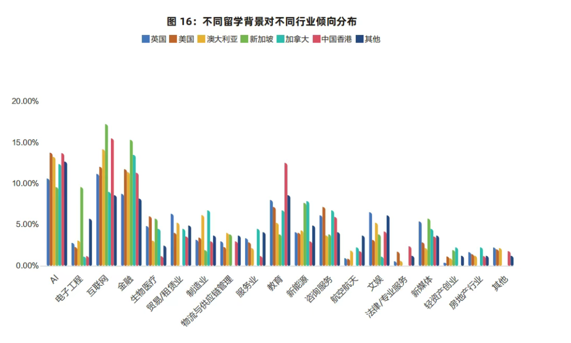 - 港硕则对教育行业情有独钟,在钟情于互联网和AI的同时,有高达13.91%的人选择了教育行业,比例远高于其他留学地。