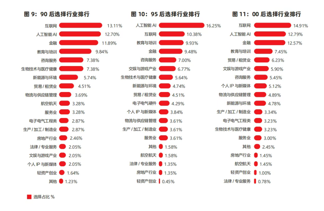细分各年龄段来看:90后中,互联网与AI合计占比近26%,同时对金融、教育培训等传统高价值行业也颇为青睐;95后对AI的偏好略高于互联网,教育行业跻身第三;00后中,互联网、AI、金融的总占比超39%,贸易租赁、IP与新媒体热度上升,教育培训、生物技术偏好下降。