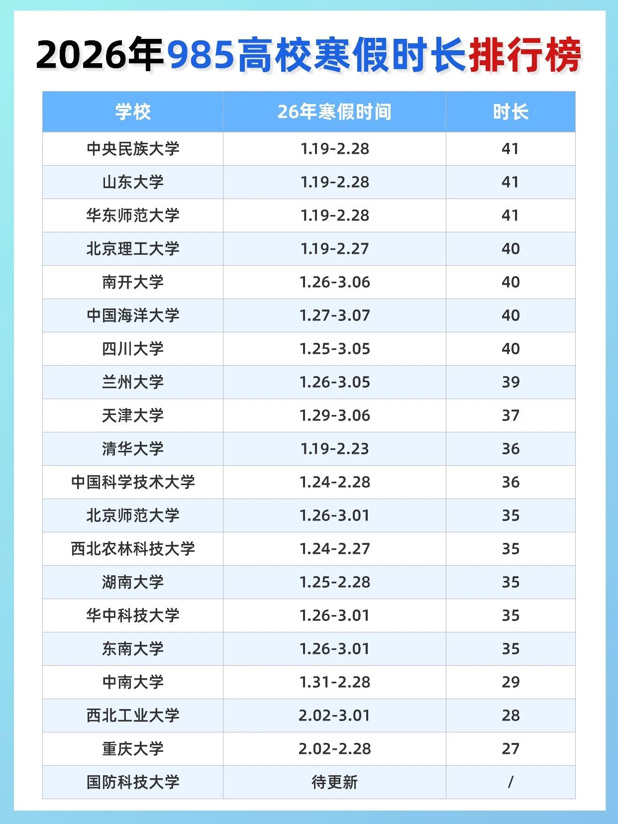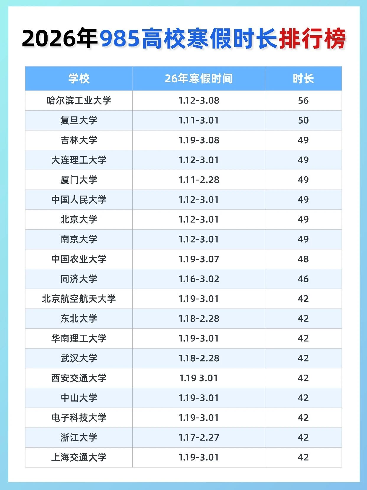 985 高校 2026 年寒假时长统计出炉!其中哈尔滨工业大学的同学迎来超长假期 —— 足足 56 天!寒假时长超过 45 天的高校包括:复旦大学、吉林大学、大连理工大学、厦门大学、中央民族大学、北京大学、南京大学、中国农业大学、西南大学、同济大学;而中南大学、西北工业大学、重庆大学的寒假时长则不足 30 天。