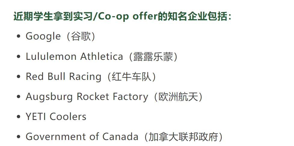 合作的雇主名单也星光熠熠。近期学生获得的实习机会来自谷歌、露露乐蒙、红牛车队、加拿大联邦政府等全球知名企业与机构。