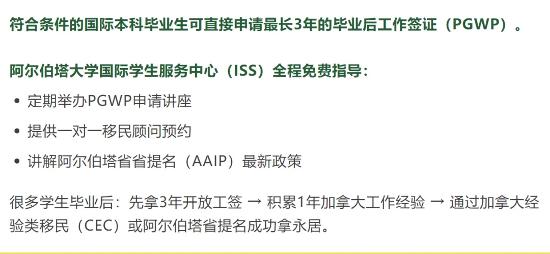 通过先积累1年加拿大工作经验,再申请联邦经验类移民或阿尔伯塔省提名,已成为众多国际毕业生成功获得永久居留权的成熟路径。学校也会举办省提名和联邦快速通道政策解读会,帮助学生规划未来。