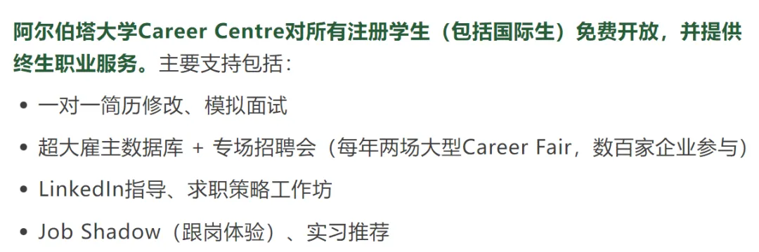 对于国际学生而言,求职不仅是个人能力的比拼,更需要专业的指导。阿尔伯塔大学职业中心提供一项至关重要的承诺:为所有注册学生(包括国际生)提供终身的免费职业服务。